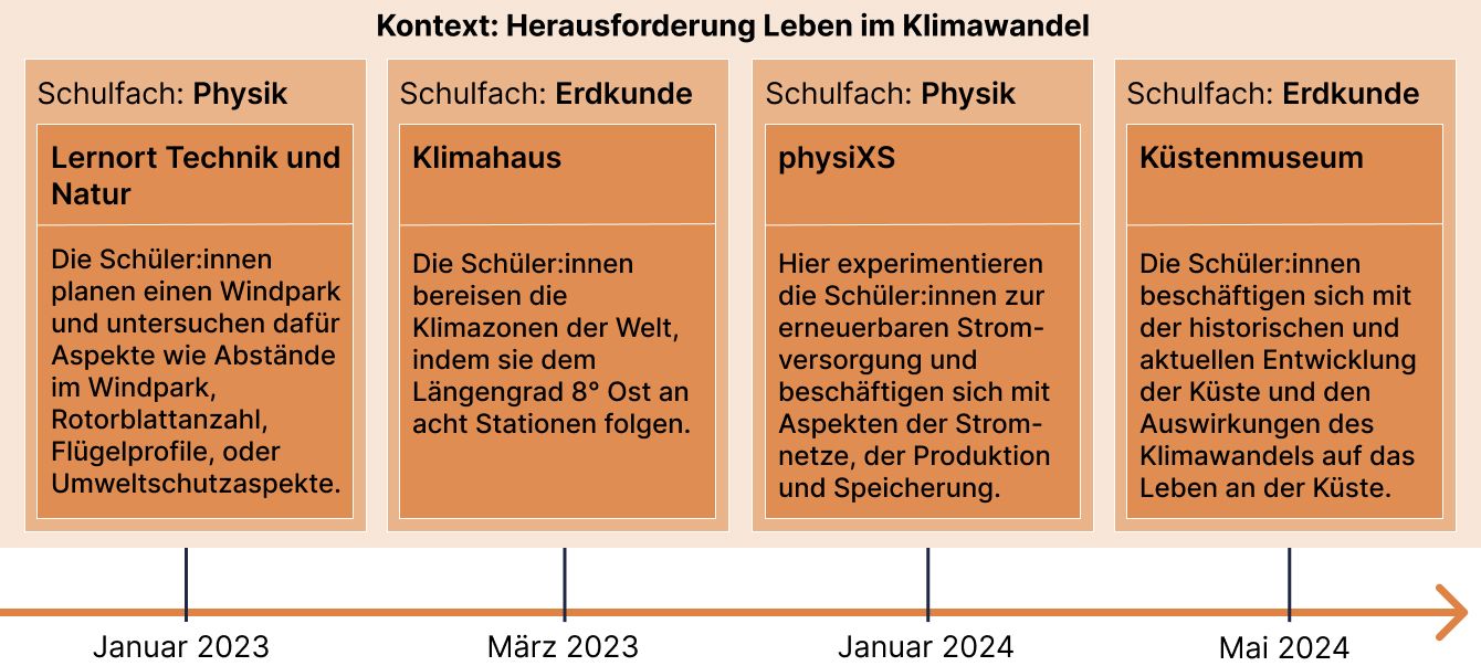 Komplexe gesellschaftliche Herausforderungen wie den Klimawandel zu verstehen und ihn anzugehen, erfordert das Zusammenspiel vieler disziplinärer Zugänge. Schule ist hierbei oft überfordert, weil separierte Fächer in ihren Angeboten unterkomplex bleiben. Im Projekt ReBiS (Regionales MINT-Bildungsökosystem) werden daher außerschulische Lernangebote, die meist multidisziplinär strukturiert sind, in mehrere Schulfächer eingebettet. Dadurch entsteht zum komplexen Thema Klimawandel ein neues Lernangebot, an dem mehrere Fächer und außerschulische Lernorte beteiligt sind. Es weist eine dem Thema angemessene Komplexität auf, ohne Lehrkräfte und Schüler:innen zu überfordern. ReBiS wird von der Deutschen Telekom Stiftung gefördert; im Raum Wilhelmshaven/Friesland/Oldenburg wirken sechs außerschulische Lernorte und vier Schulen mit vielfältigen Fächerkombinationen mit. Die Schulklassen wählen einen Problemkontext, den sie aus unterschiedlichen Fächern heraus und über mindestens ein Schuljahr lang bearbeiten. Im Beitrag stellen wir einen konkreten Zugang vernetzter außerschulischer und schulischer Bildung im Kontext ‚Herausforderung Leben im Klimawandel’ vor, wie er am Neuen Gymnasiums in Wilhelmshaven (NGW) umgesetzt wird.